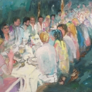 In mijn vorig brief beschreef ik de uitdaging om een lunch in de open lucht met 26 gasten real time in verf vast te leggen. Spannend en geweldig om te doen. Uiteindelijk heb ik twee schilderijen gemaakt.
